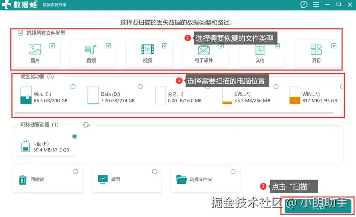 步骤1: 打开数据 蛙恢复专家,在软件的首页选好需要恢复的文件类型,然后选择需要扫描的磁盘,最后才点击“扫描”;