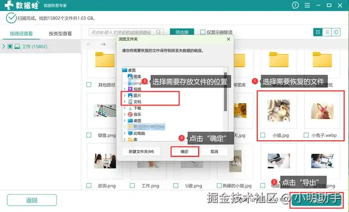 步骤2: 在扫描结果的页面下选择需要恢复的文件,点击“导出”,在弹窗中选择需要存放恢复文件的电脑位置,完成恢复。