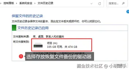 步骤1: 在电脑“设置”中找到“文件历史记录”功能,启用“文件历史记录”后选择一个存放恢复文件备份的驱动器;