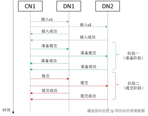 GaussDB分布式数据库的写一致性是通过两阶段提交(2PC)协议实现的,两阶段提交协议将分布式事务的提交操作分为两个阶段,如图4所示: