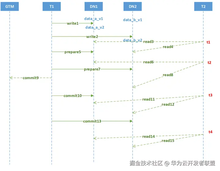 4)T2事务在t4,同时发起向DN1和DN2的读操作(对应read14和read15),DN1返回data_a_v2,DN2阻塞到commit13消息后返回data_b_v2,两个都是V2版本,所以,此时T4读取的数据是一致的。
