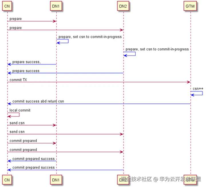 参与者节点(DN)在完成prepare阶段后,会将事务的状态设置为commit-in-progress。当所有DN prepare完毕后,协调者节点(CN)通知GTM进行事务提交,并获取到一个全局唯一的事务提交序列号CSN值。