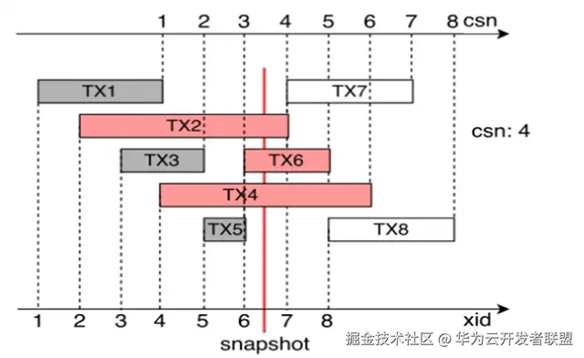 图2中,棕色竖线表示取snapshot时刻,如果使用活跃事务列表快照方式,那么棕色竖线对应snapshot的集合应该是{2,4,6}。如果采用GaussDB的基于提交时间戳CSN的快照方案,会获取当前的CSN值,也就是3,事务TX2、TX4、TX6、TX7、TX8的CSN分别为4、6、5、7、8,对于该snapshot而言,这几个事务的修改都不可见。