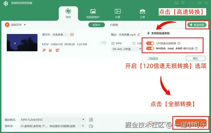 步骤3:点击【高速转换】,开启【120倍速无损转换】选项,然后点击【全部转换】。