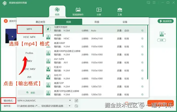 步骤2:点击【输出格式】选择视频格式列表下的【mp4】格式。