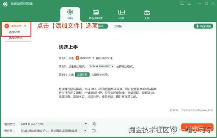 步骤1:打开该视频格式转换器,在视频格式转换选项下,点击【添加文件】选项。