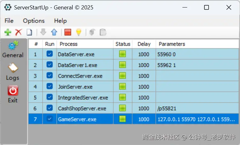 然后右键 管理员方式 运行 “2.启动服务端” , 点击绿色的按钮,然后等待服务启动,只要是下面7个灯都是绿色的才启动完成!!!
