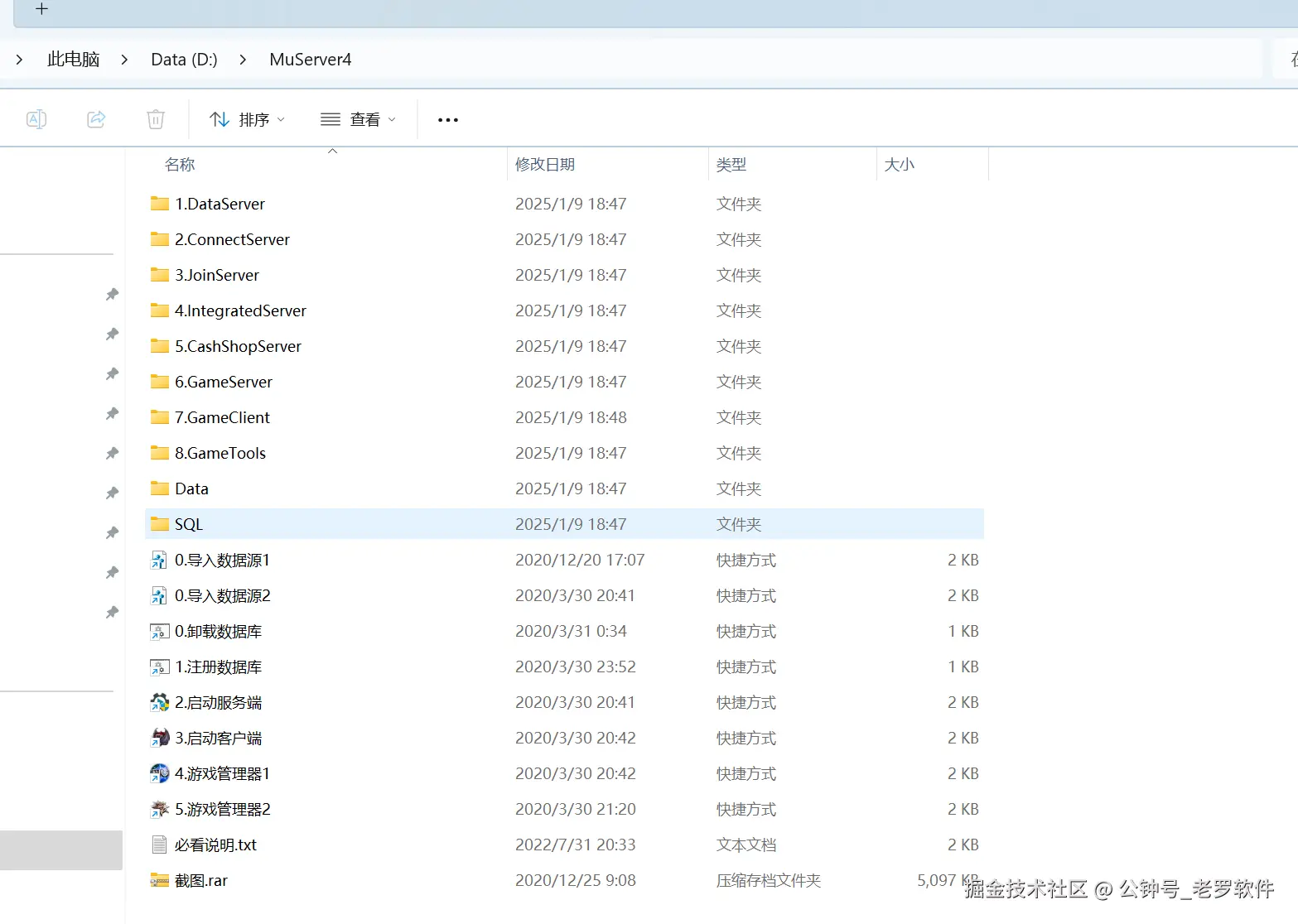 此游戏架设无需虚拟机,将游戏文件放入D:\MuServer4 , 需要用户自己新建一个 MuServer4 , 目录要跟下面图片保持一致,否则启动失败。如果没有D盘的朋友,直接百度下 “win10如何新增D盘即可” 。
