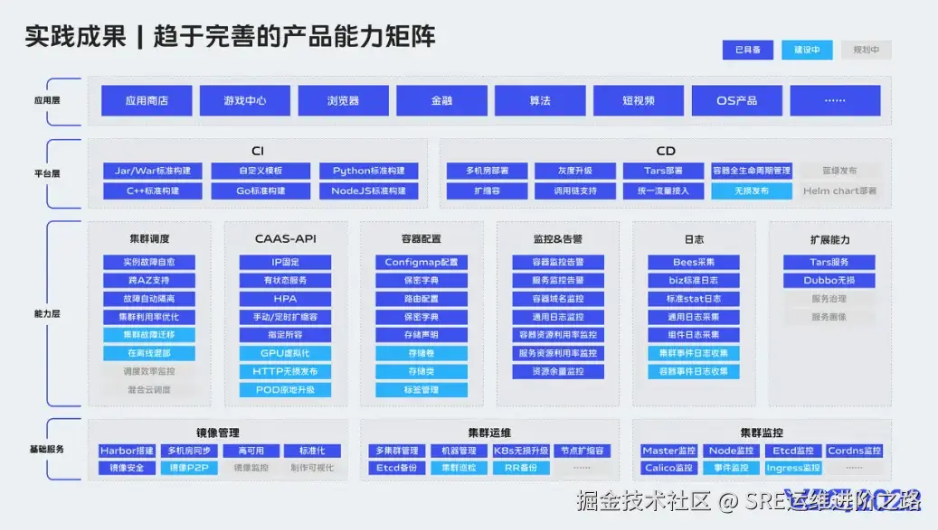2021年,收获的阶段,线上线下、研发测试交付全流程打通,业务全面接入,基础设施对研发和业务方透明,在离线统一调度,容器数量达到数十万。