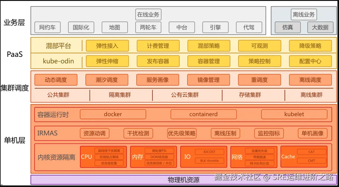- 单机如何进行内核层面的资源隔离策略,包括CPU、内存、IO、LLC cache、网络等资源,来保障高优业务的服务质量