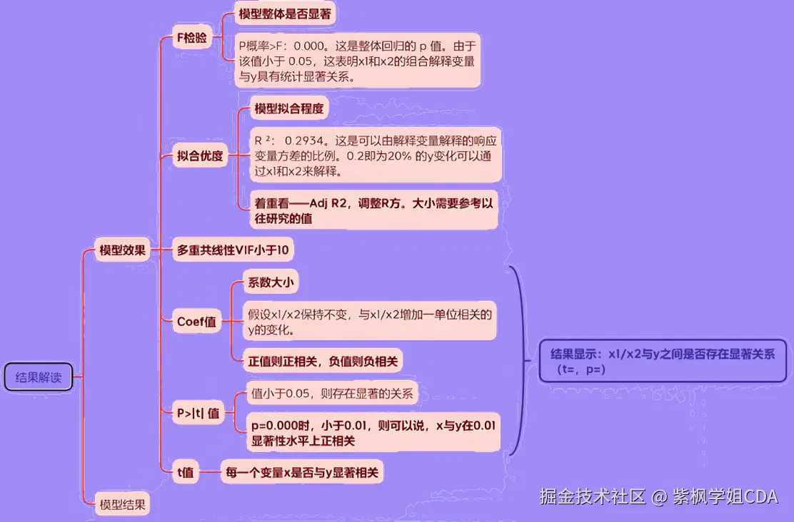 - F检验用于检验整体模型的显著性,评估至少有一个自变量对因变量的预测能力是否显著。