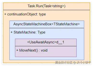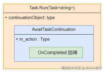 从卦中看,本质上就是借助AsyncTaskMethodBuilder<string> 建造者将 awaiter 和 stateMachine 做了一个绑定,感兴趣的朋友可以追一下 AwaitUnsafeOnCompleted() 方法,最后状态机 <UseAwaitAsync>d__1 实例会放入到 Task.Run 的 m_continuationObject 字段。如果有朋友对流程比较蒙的话,我画了一张简图。