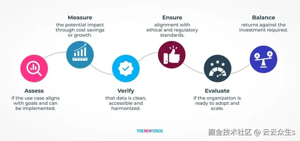 为生成式AI的采用制定路线图需要一种结构化的方法来评估和优先考虑用例。在HBR白皮书中,Infosys副总裁兼CXO顾问建议根据六个维度评估用例,以确定最有可能产生价值的用例: