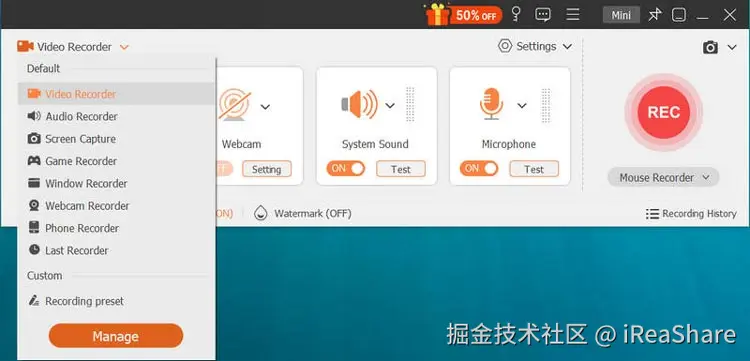 毫无疑问,当你需要在桌面上录制TikTok时,最好使用iReaShare Screen Recorder。该应用对录制屏幕上的每一个动作都有最佳支持。与其他屏幕录像机相比,它是一个更专业的应用,因为它提供了一个全面的录制功能,视觉上高清且清晰地录制内部和外部音频。