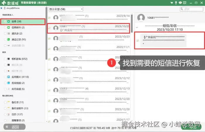 步骤2:等待软件扫描可恢复的内容,在扫描结果中选择【信息】并查看需要的信息进行恢复,恢复后可保存到电脑上进行保存。