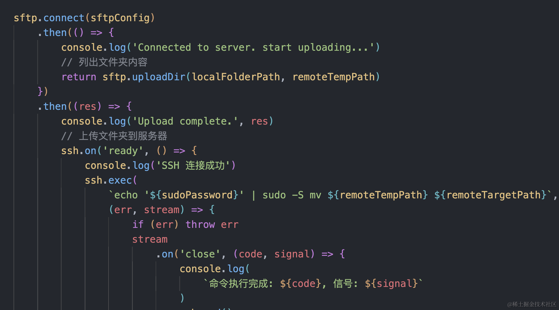 有时候因为服务器不能实现github或者gitlab的自动部署服务,所以就需要使用脚本来实现自动部署,可以省时省力,一劳永逸。这里就使用ssh2-sftp-client和ssh2来实现,即便是需要sudo权限,也是可以的。