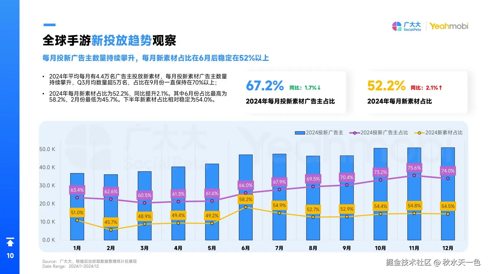 在月度数据中,我们注意到除去第一季度,2024年每月手游广告主数量稳定超过6.5万名。然而,新广告主的占比却呈现出下降趋势,这可能意味着市场逐渐成熟,新入局者的机会相对减少,但同时也反映出现有广告主的稳定性和市场的竞争加剧。