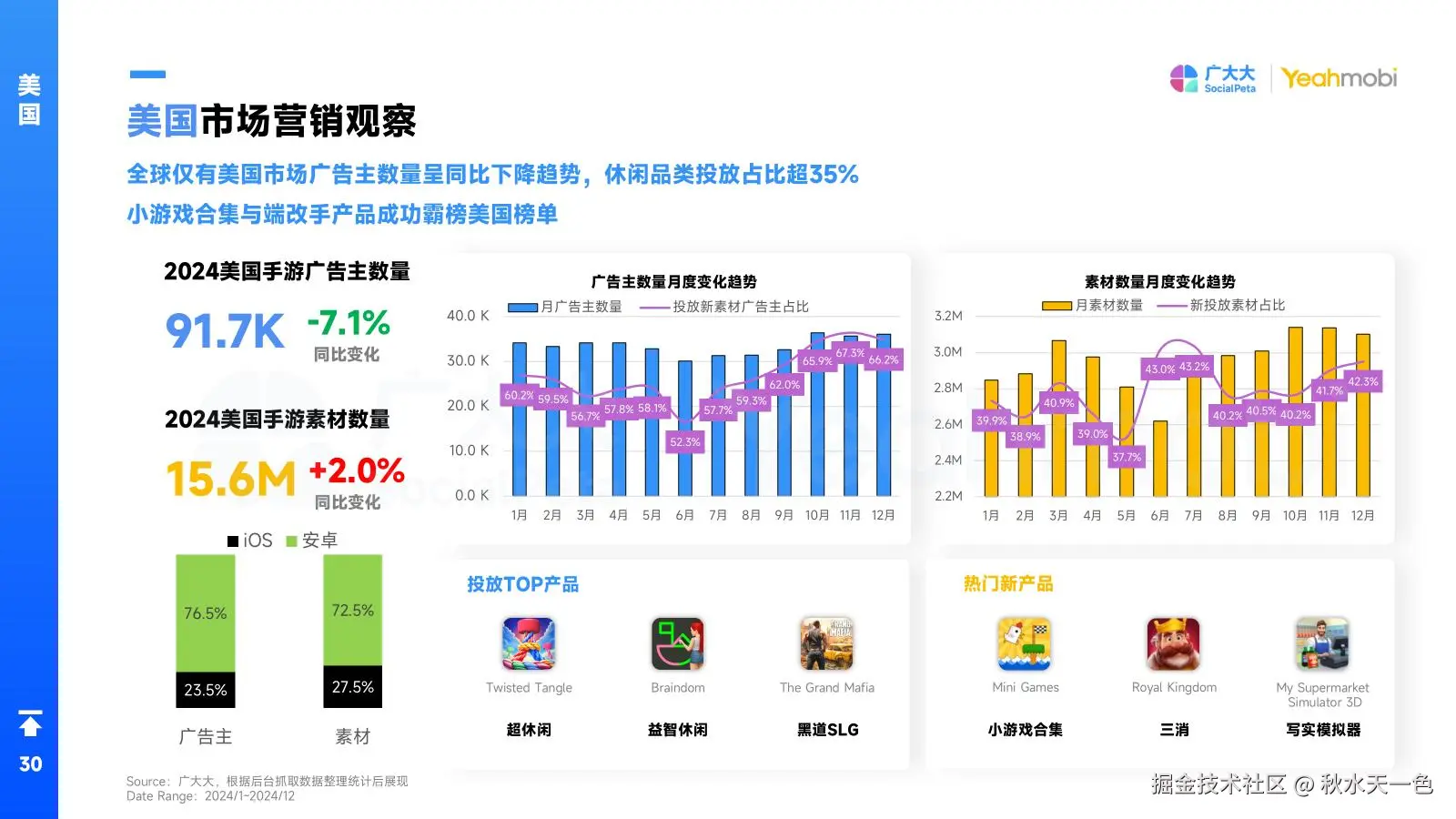 在全球手游市场中,美国是唯一一个广告主数量呈同比下降趋势的市场。其中休闲品类的投放占比超过35%,小游戏合集与端改手产品在美国榜单上取得了显著的成功。2024年,美国手游广告主数量为91.7K,同比下降7.1%,而手游素材数量为15.6M,同比小幅增长2.0%。这一现象表明,尽管广告主数量有所减少,但市场对于高质量素材的需求仍在增长。