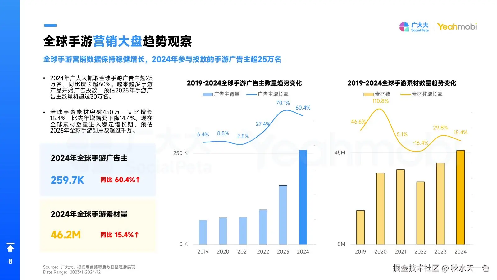 2024年,全球手游营销领域迎来了显著的增长。广告主数量超过25万名,同比增长60.4%,这一数字的激增表明了手游产品对于广告投放的重视和依赖。同时,手游素材量也突破了450万,同比增长15.4%。