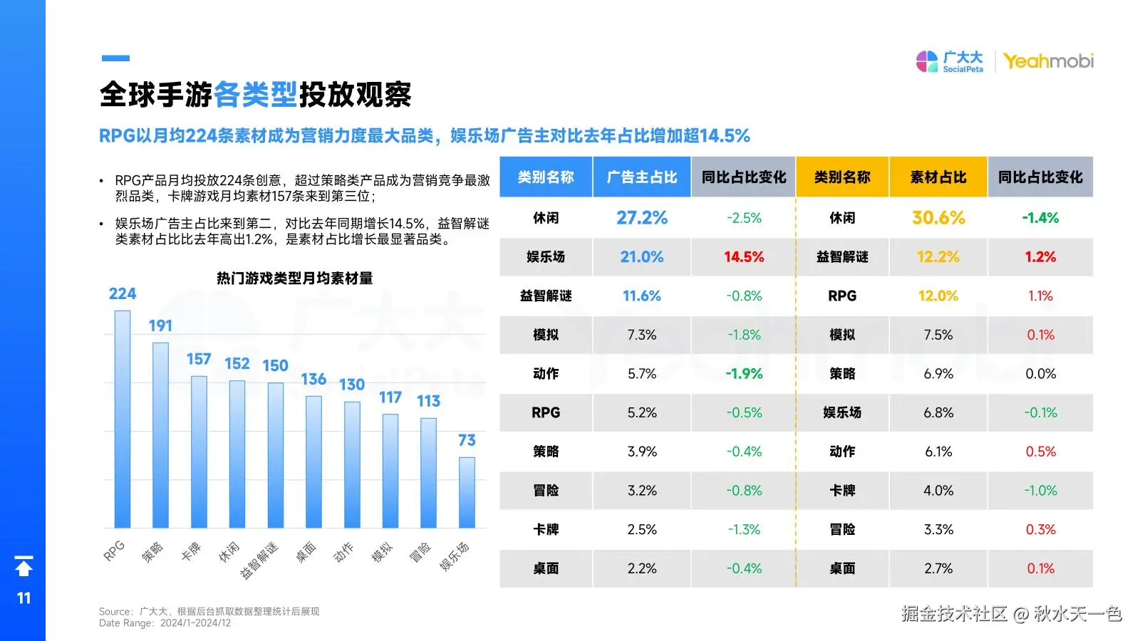 在2024年,全球手游市场的广告投放策略呈现出多样化的发展趋势。RPG手游以月均224条素材的投放量,成为营销力度最大的品类,超越了策略类产品,成为市场竞争最激烈的品类之一。同时,娱乐场广告主的占比增长超过14.5%,益智解谜类素材占比也比去年高出1.2%,显示出这两类市场的巨大潜力和玩家的高度关注。
