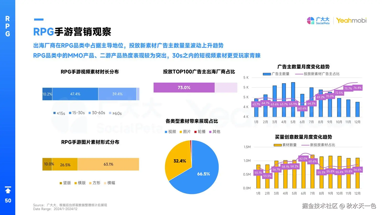 在RPG手游的营销领域,出海厂商在RPG品类中占据了主导地位,投放新素材广告主数量呈现出波动上升的趋势。特别是MMO和二游产品在市场中的热度较高,30秒以内的短视频素材更受玩家青睐。这反映了玩家对于快节奏、高效率游戏内容的偏好,也为厂商提供了明确的营销方向。