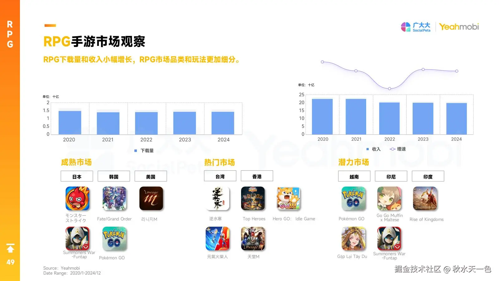 RPG手游市场在2024年下载量和收入均实现了小幅增长,特别是在成熟市场如日本、韩国和美国,以及潜力市场如越南、印尼和印度,RPG手游的表现尤为突出。热门游戏如【Summoners War】【Fate/Grand Order】和【Pokemon GO】。