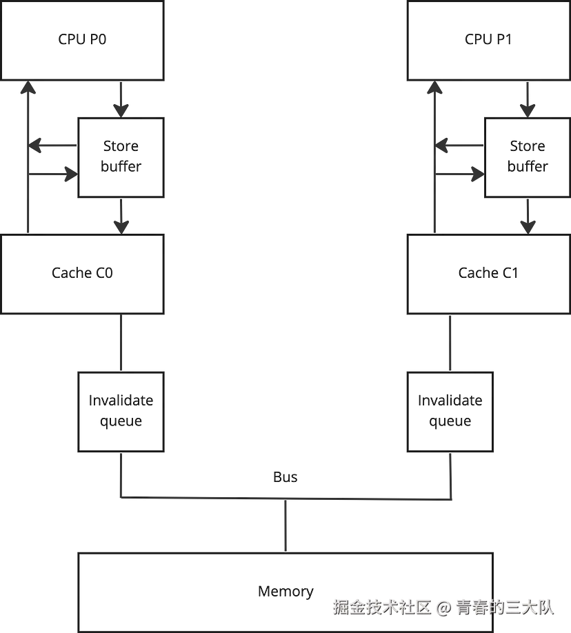 Invalidate Queue:当 CPU0 接收到 Invalidate (使无效)的消息后,并不会立即响应,而是将消息存储到 Invalidate Queue 中并立即返回 Invalidate Ack 消息,然后 CPU0 在合适的时机执行 Invalidate 操作。