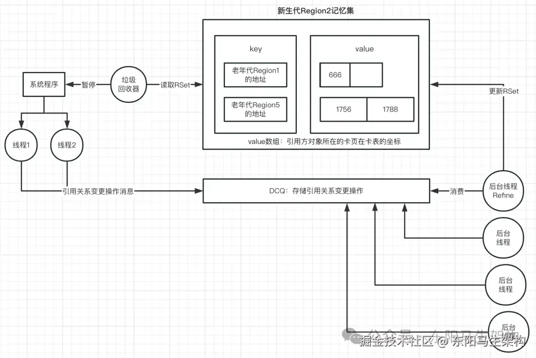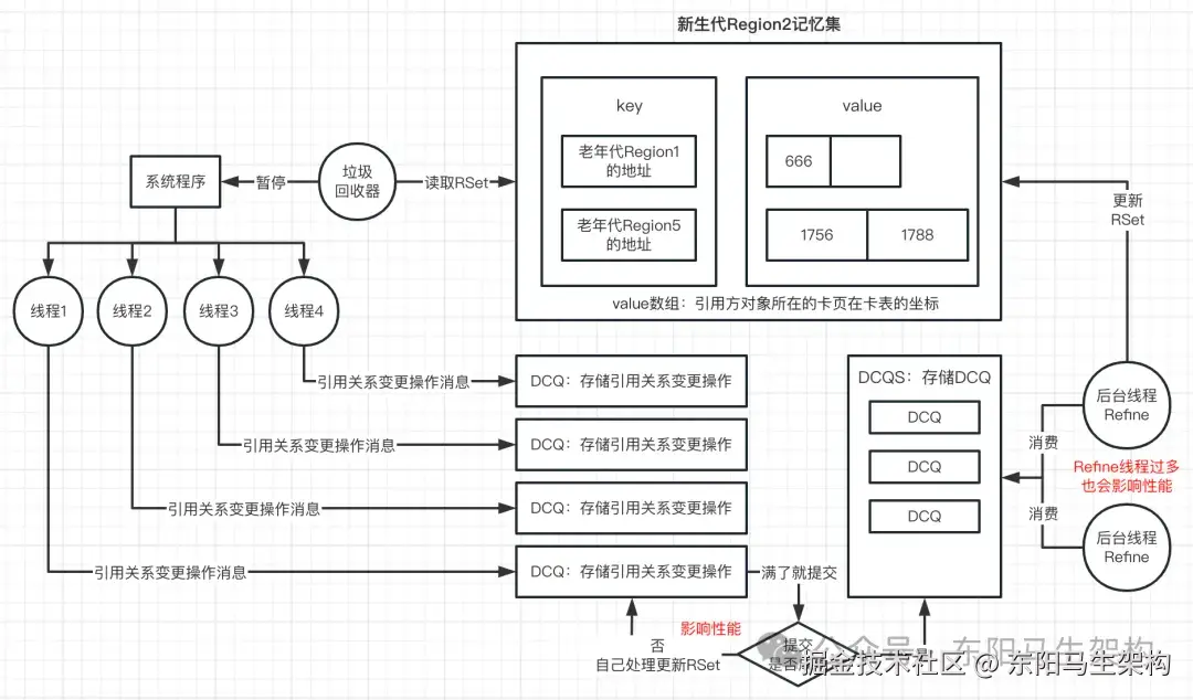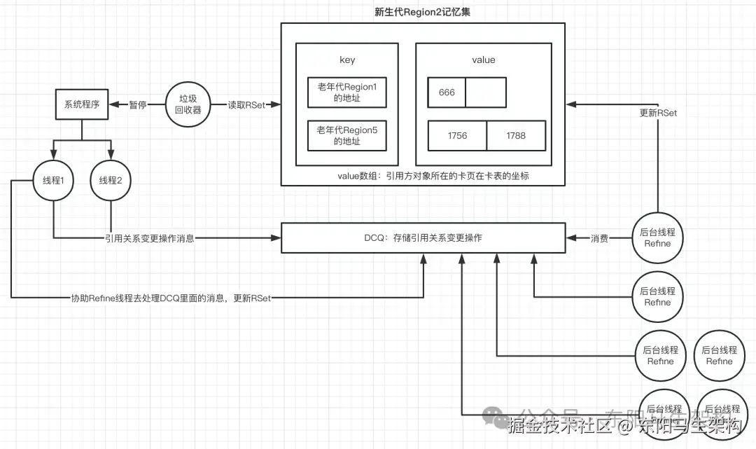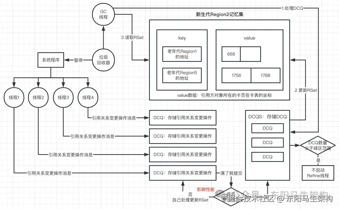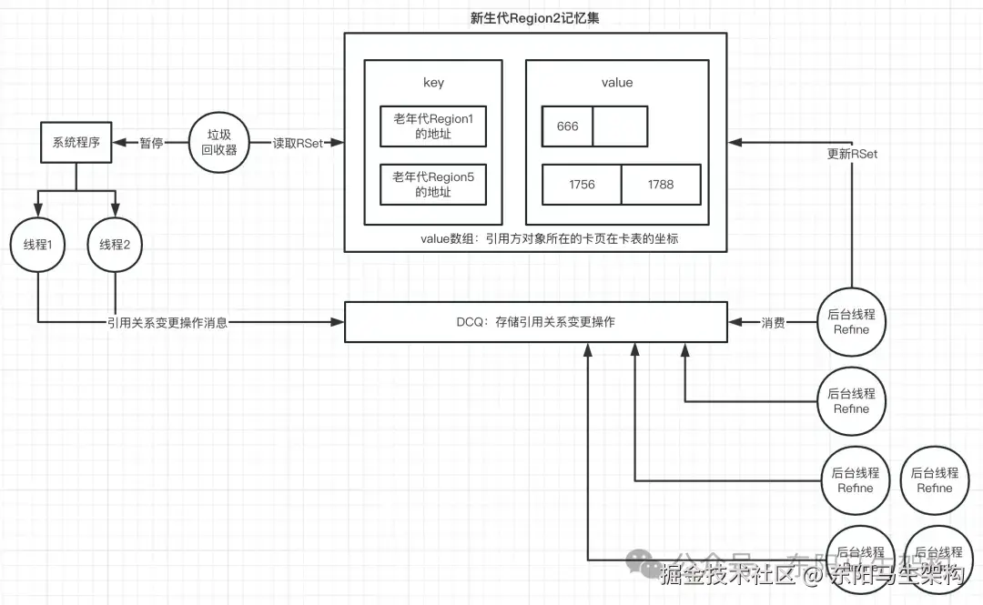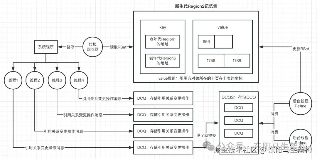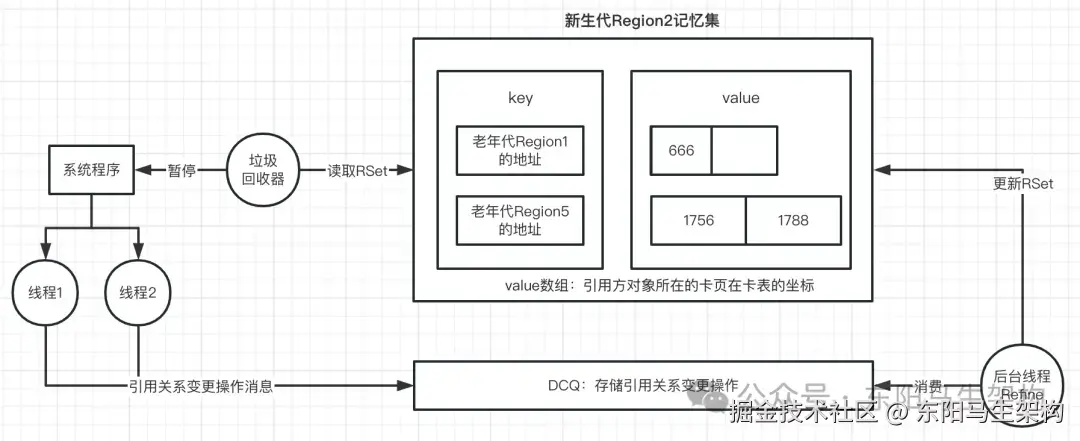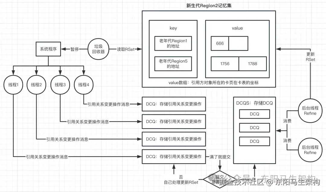 所以G1就设计了一个叫做DCQ(Dirty Card Queue)的队列。在每次有引用关系变更时,就把这个变更操作,发送一个消息到DCQ里,然后有一个专门的线程去异步消费。