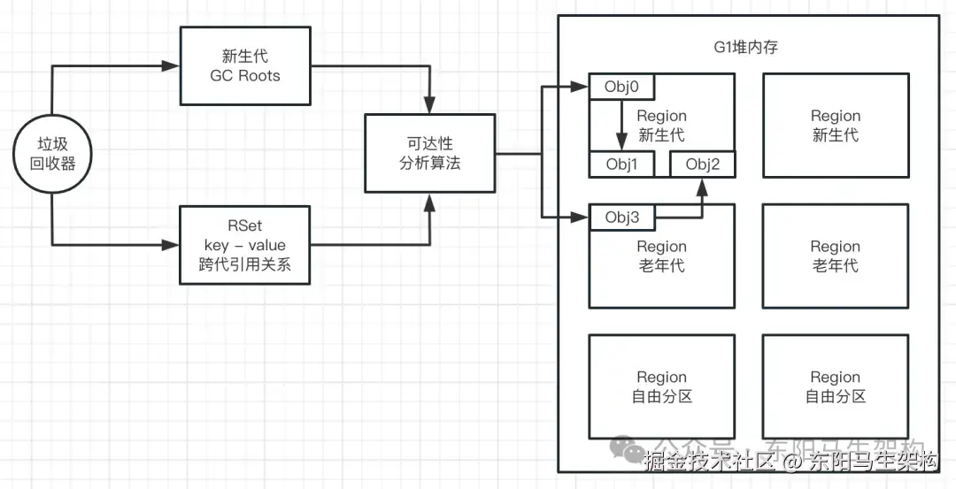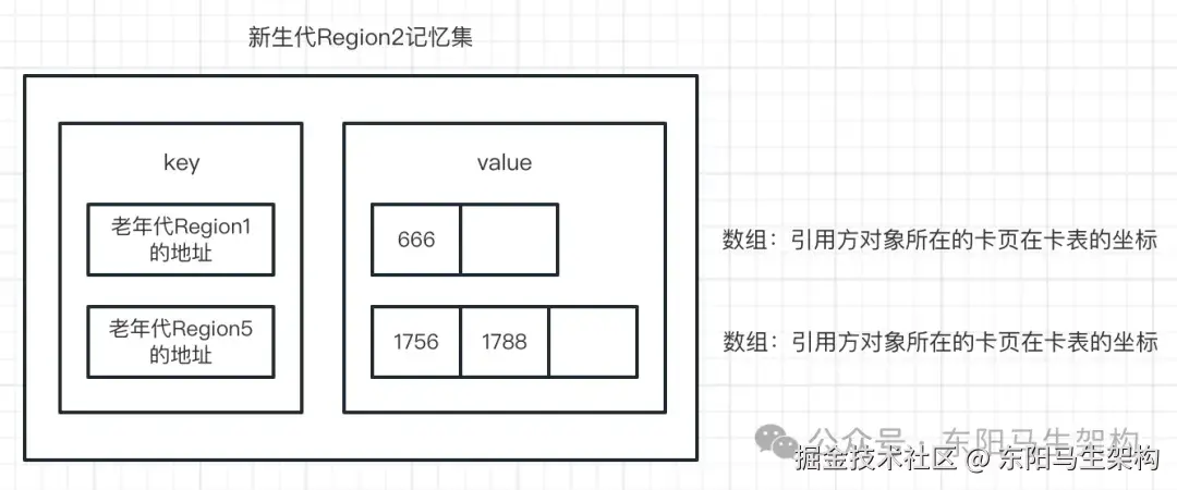 如何找出引用了新生代对象的所有老年代对象?难道只能遍历老年代?RSet记忆集,就是为了解决这个问题而设计的。RSet记忆集,会使用一组key-value结构来记录跨代引用的引用关系。这样在GC时就可以借助GC Roots + 记忆集,快速解决同代引用及跨代引用的可达性分析问题。如下图示: