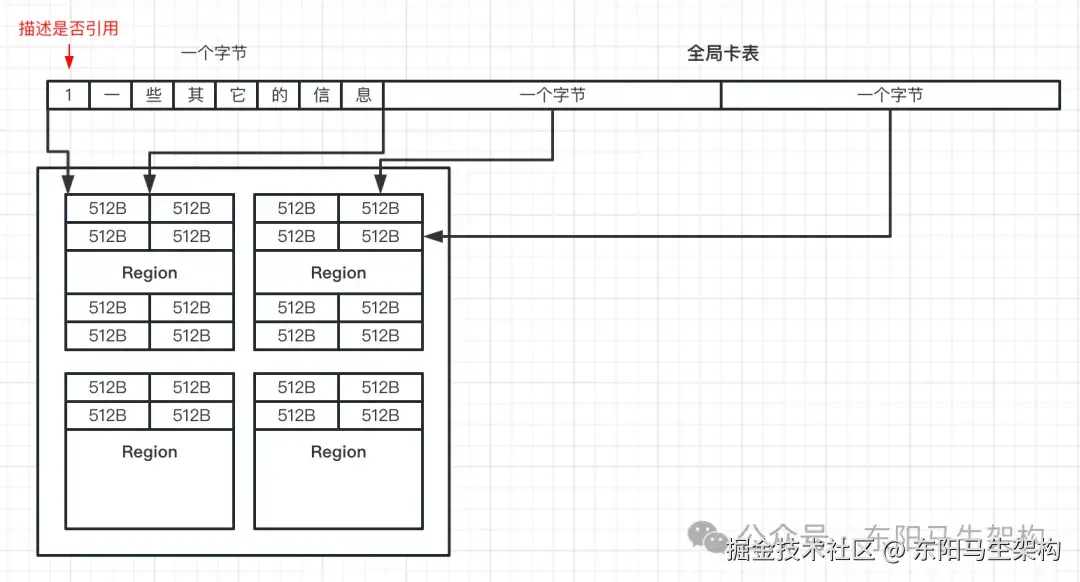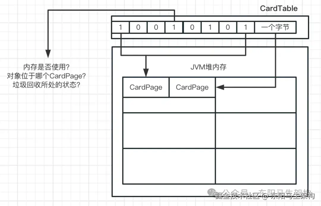 所以这个时候卡表CardTable就出现了,卡表CardTable里可以用1个字节来描述512字节内存的引用关系。这样RSet里就可以只记录CardTable相关内容,这样就能节省很多内存。比如发现老年代有一块512字节的空间里的对象引用了新生代的一个对象,那么记忆集Rset只需要直接记录这个512字节的空间在卡表里的位置即可。