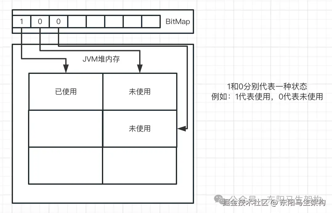 为了描述内存的使用状态,JVM使用了位图,也就是JVM会在一个位图里记录所有内存的使用状态。如果JVM要要知道某一块内存是否被使用,就直接访问位图中这块内存对应的坐标内容来进行判断,看是否已使用。如下图示: