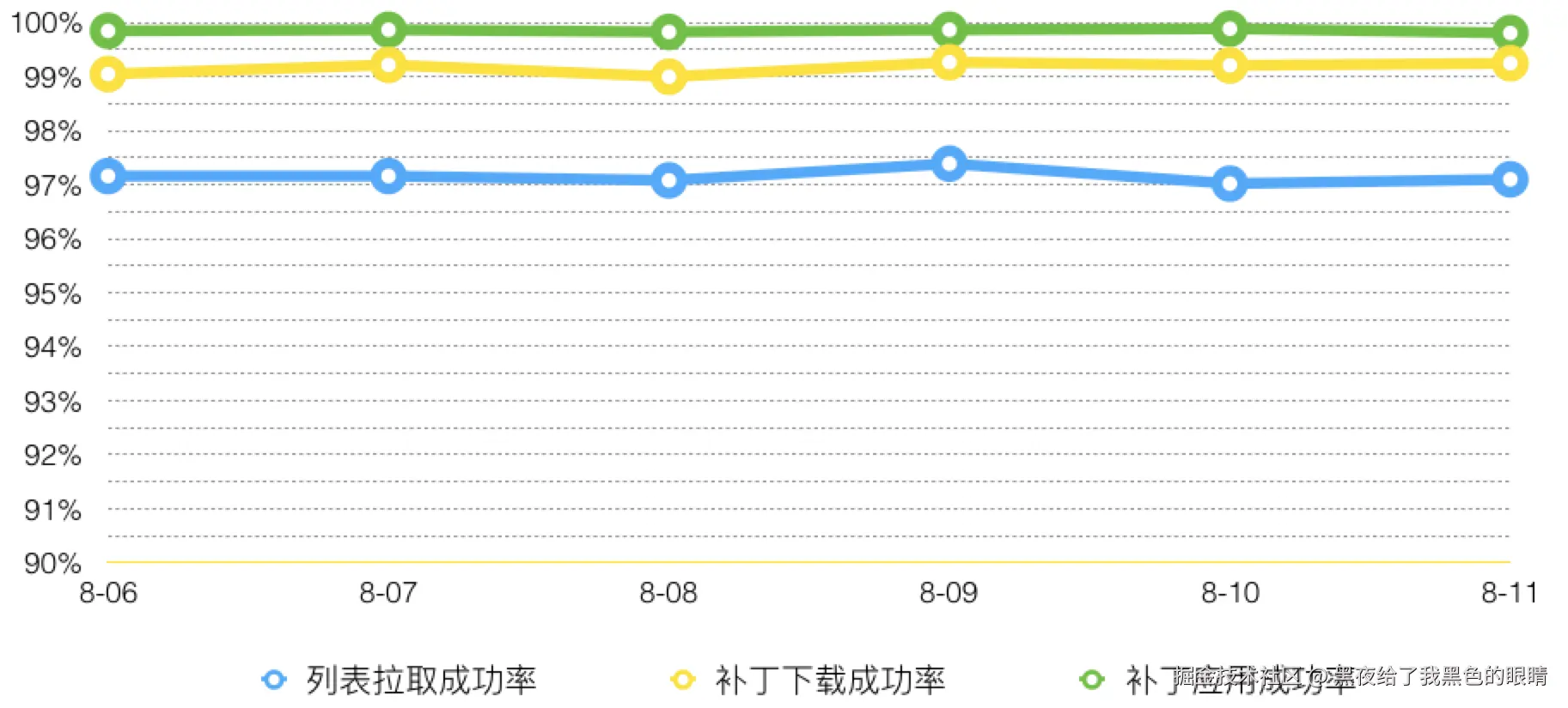 先简单解释下这几个指标: 补丁列表拉取成功率=拉取补丁列表成功的用户/尝试拉取补丁列表的用户 补丁下载成功率=下载补丁成功的用户/补丁列表拉取成功的用户 patch应用成功率=patch成功的用户/补丁下载成功的用户