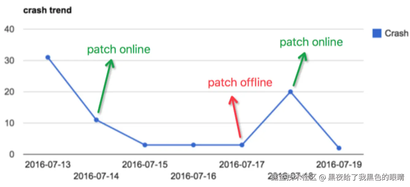 通过这个表能够看出,我们的patch信息拉取的成功最低,平均97%多,这是因为实际的网络原因,而下载成功后的patch成功率是一直在99.8%以上。而且我们做的是无差别下发,服务端没有做任何针对机型版本的过滤,线上的结果再次证明了Robust的高兼容性。