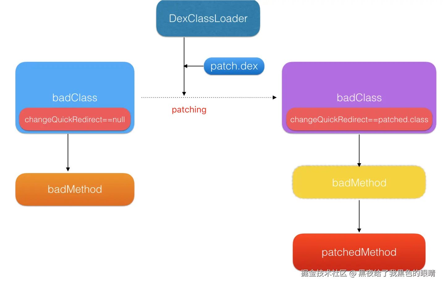 客户端拿到含有PatchesInfoImpl.java和StatePatch.java的patch.dex后,用DexClassLoader加载patch.dex,反射拿到PatchesInfoImpl.java这个class。拿到后,创建这个class的一个对象。然后通过这个对象的getPatchedClassesInfo函数,知道需要patch的class为com.meituan.sample.d(com.meituan.sample.State混淆后的名字),再反射得到当前运行环境中的com.meituan.sample.d class,将其中的changeQuickRedirect字段赋值为用patch.dex中的StatePatch.java这个class new出来的对象。这就是打patch的主要过程。通过原理分析,其实Robust只是在正常的使用DexClassLoader,所以可以说这套框架是没有兼容性问题的。