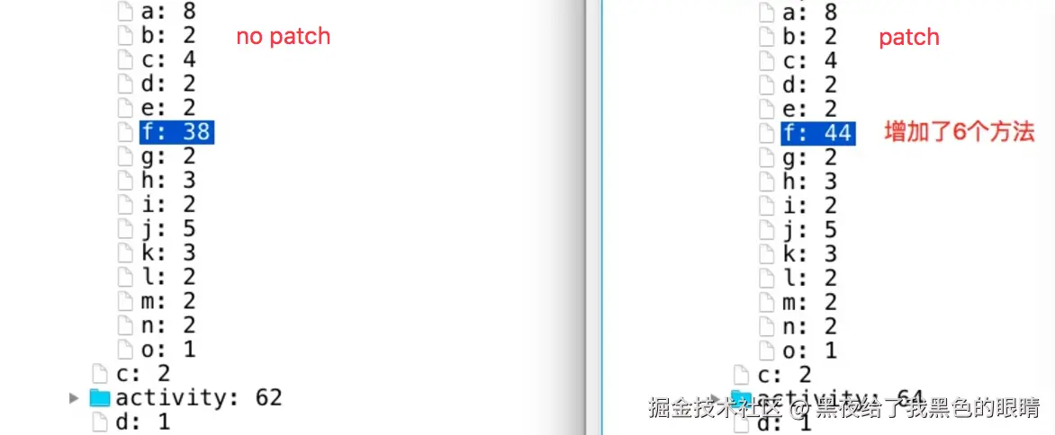 居然不能打出包来了!从原理上分析,除了引入的patch过程aar外,我们这套实现是不会增加别的方法的,而且引入的那个aar的方法才100个左右,怎么会造成美团的mainDex超过65536呢?进一步分析,我们一共处理7万多个函数,导致最后方法数总共增加7661个。这是为什么呢?