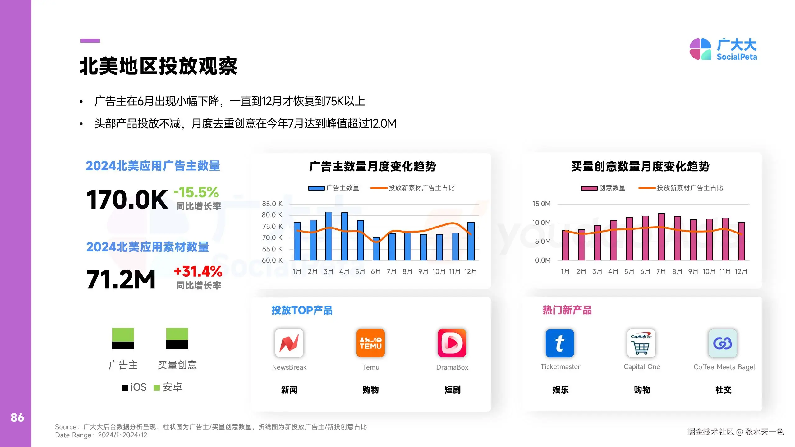 在报告的第4部分,我们整合多了热门出海地区的出海营销数据,以北美地区为例,2024年尽管该地区的广告主数量在6月经历了小幅下降,但到了12月已恢复至75K以上。与此同时,应用素材数量显著增长,达到71.2M,同比增长31.4%。特别是在7月,去重创意数量达到了超过12.0M的峰值。整体而言,尽管广告主数量有所下降,但广告素材的创新和投放力度并未减弱,显示出该市场对高质量广告内容的持续需求。