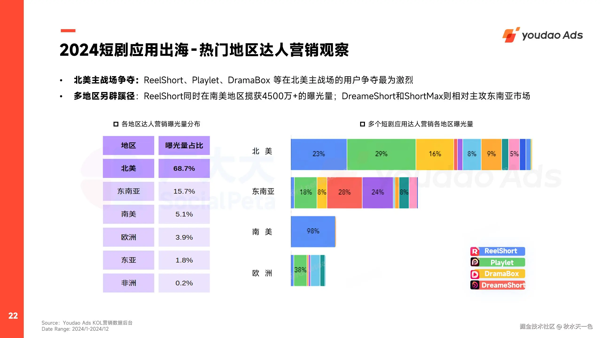 北美作为短剧出海的首要战地,其达人营销曝光量占比远超其他地区达到68.7%,【ReelShort】【Playlet】和【DramaBox】在该地区争夺用户最为激烈;同时,【ReelShort】在南美地区的曝光量形成了统治态势,【DreameShort】和【ShortMax】则主要进攻东南亚市场。