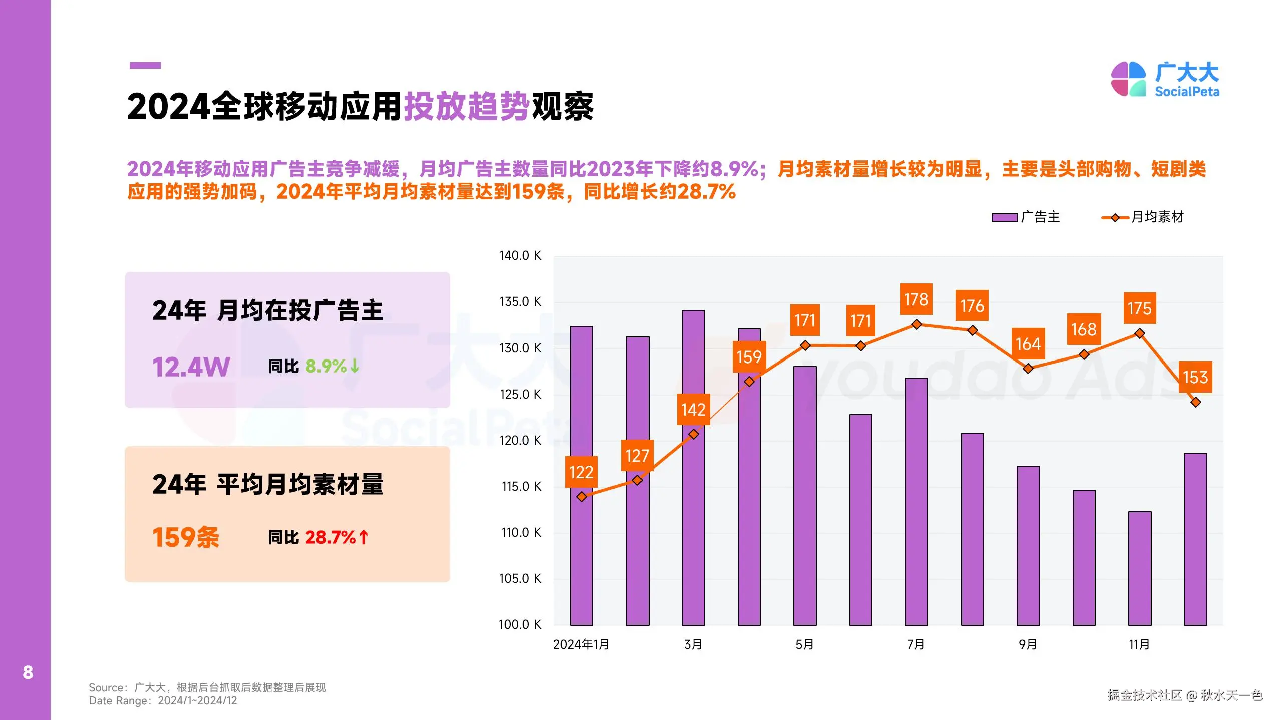 首先我们来看看2024年的整体数据:2024年移动应用广告主竞争减缓,月均广告主数量同比2023年下降约8.9%;月均素材量增长较为明显,主要是头部购物、短剧类应用的强势加码,2024年平均月均素材量达到159条,同比增长约28.7%。
