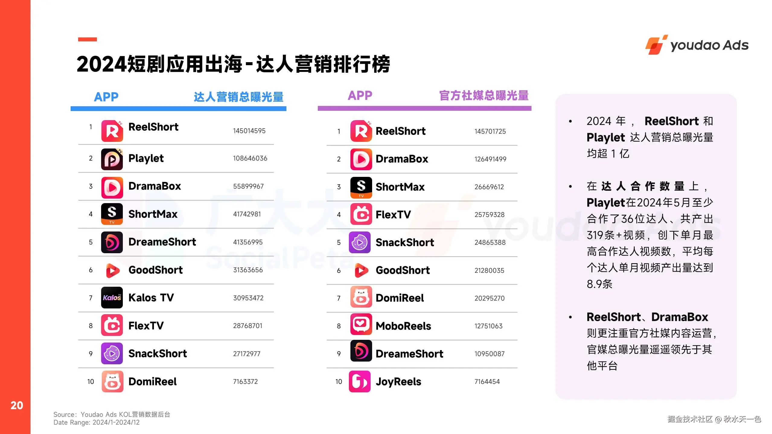 达人营销层面,由短剧出海老大哥【ReelShort】拔得头筹,总曝光量超过1亿,排名第二的【Playlet】也同样达成了这个成就。由Youdao Ads KOL营销数据后台统计发现,【Playlet】在2024年5月至少合作了36位达人、共产出319条+视频,创下单月最高合作达人视频数,平均每个达人单月视频产出量达到8.9条。