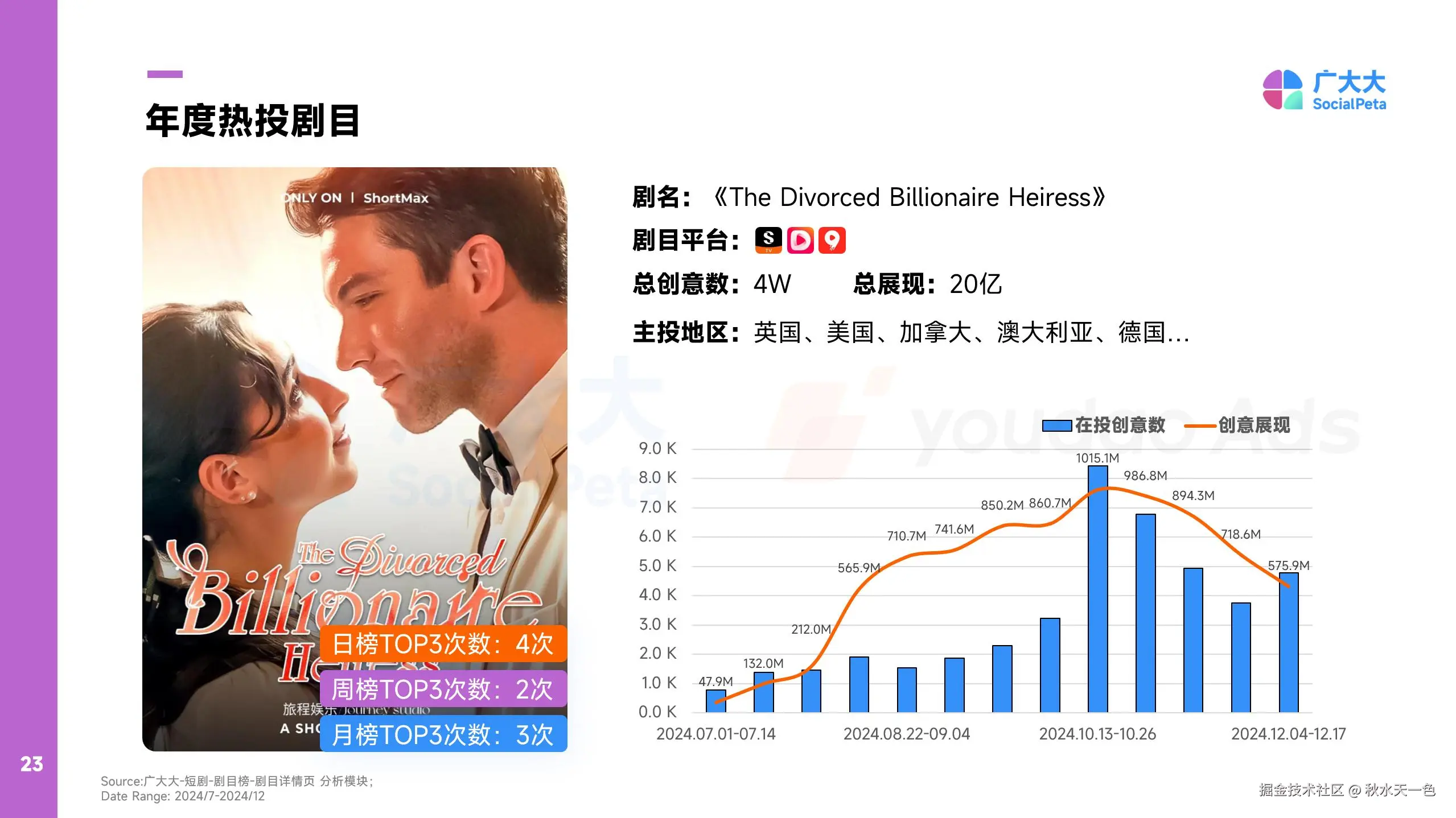 不过即使是大厂推出的短剧平台,要真正出圈仍要依靠大量优质的短剧。为此,广大大数据研究院统计了2024年在欧美、东南亚、日本和韩国地区的剧目投放TOP10。可以看到,在欧美地区排名靠前的大部分都是本土剧,其中【ShortMax】的《The Divorced Billionaire Heiress》以超过4W的去重创意数碾压登顶。
