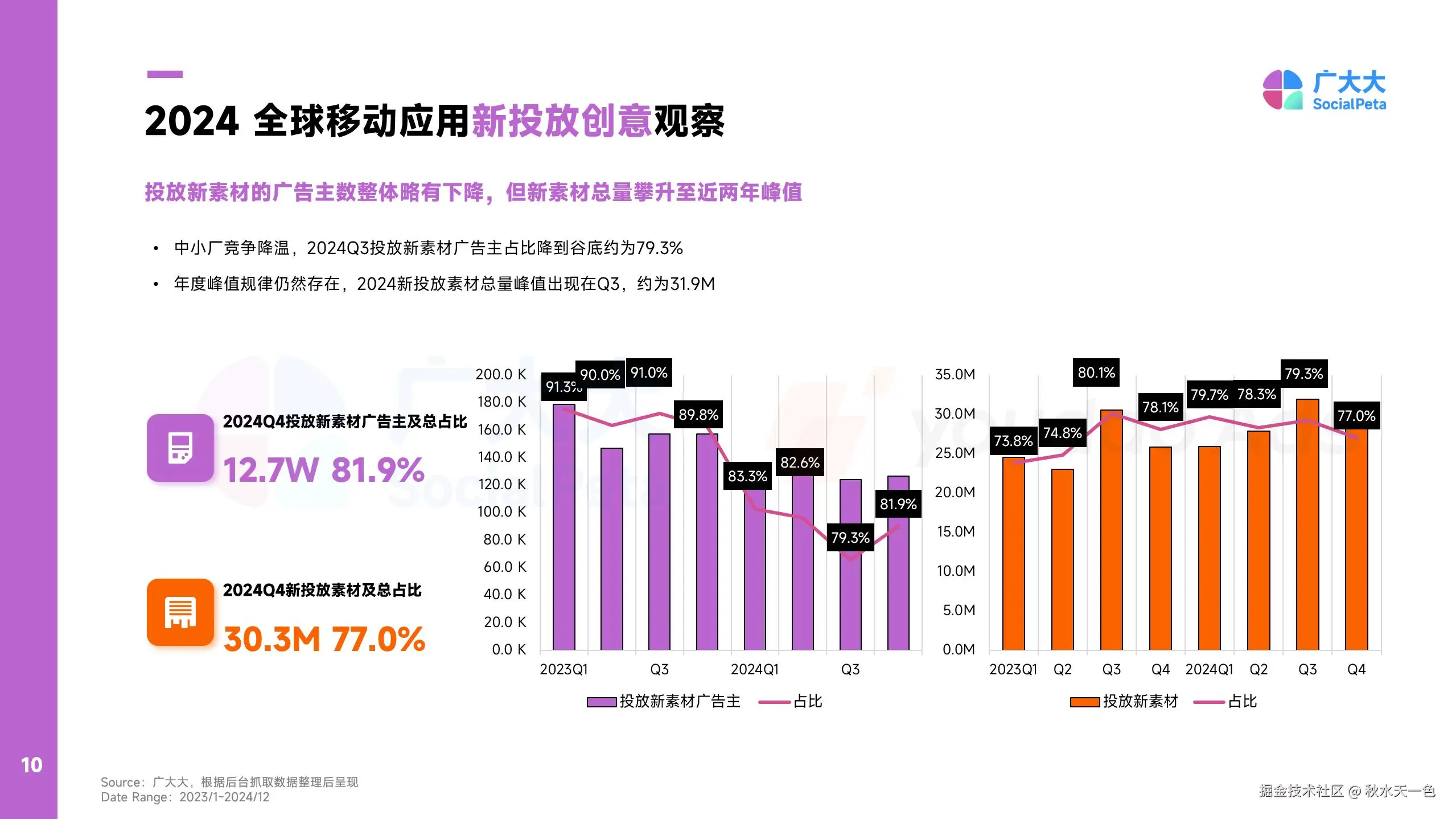 2024年全球移动应用市场在广告投放方面呈现出一些新趋势。尽管广告主数量整体略有下降,但新素材的投放总量却攀升至近两年的峰值,显示出广告主在内容创新方面的积极性。具体来看,中小厂商在2024年的竞争有所降温,特别是在第三季度,投放新素材的广告主占比降至谷底,约为79.3%。然而从全年来看,新投放素材总量的峰值依然出现在第三季度,约为31.9M,可见该季度为移动应用占据海外市场的关键节点。