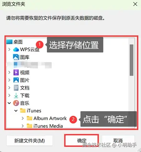 第3步: 在弹窗中选择自己恢复文件的存储位置,切记不能把文件放回原位置。