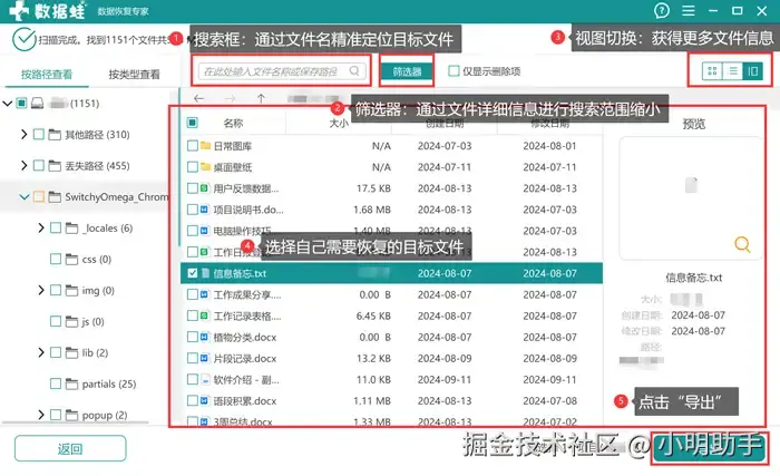 第2步: 等待软件扫描结束后,选择自己需要恢复的文件,如果想要更快找到自己的目标文件,可以选择使用上方的“搜索框”、“筛选器”,它们能够起到很大的作用。;选中目标文件后,点击“导出”。