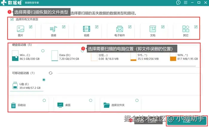 第1步: 在电脑打开数据 蛙恢复专家后,进入到这款软件的主页面。软件的功能分布清晰明了,画面上部分是选择需要恢复的文件类型,中下部分是选择扫描位置,即文件丢失的位置,选择完毕后再点击右下角的“扫描”。