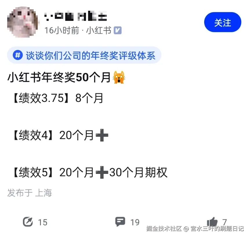 综合下来,今年 xhs 最高有 50 个月的年终奖,就这帖子,还是带有「xhs 职业认证」(至少通过了企业邮箱认证)的网友发的 🤣🤣🤣