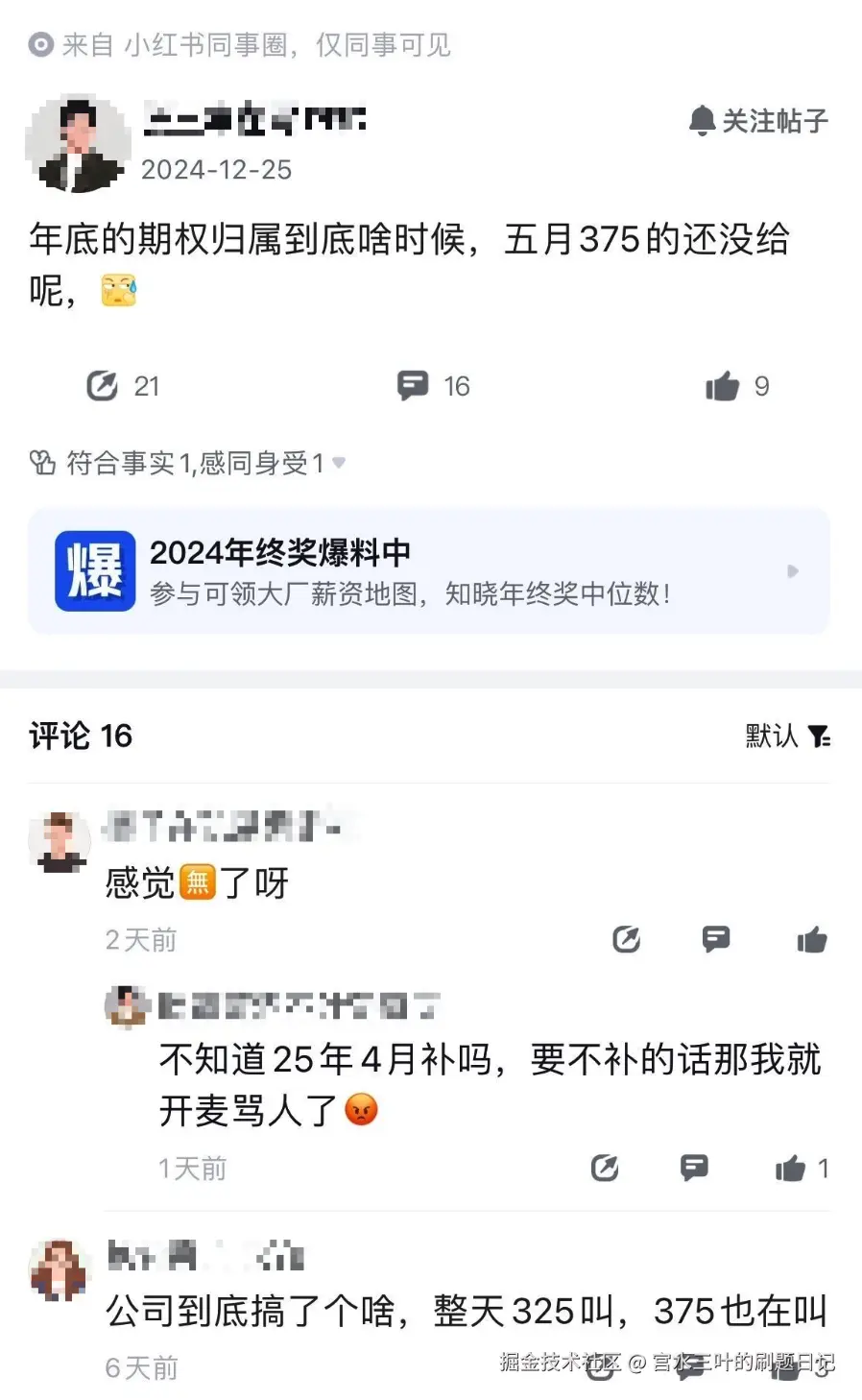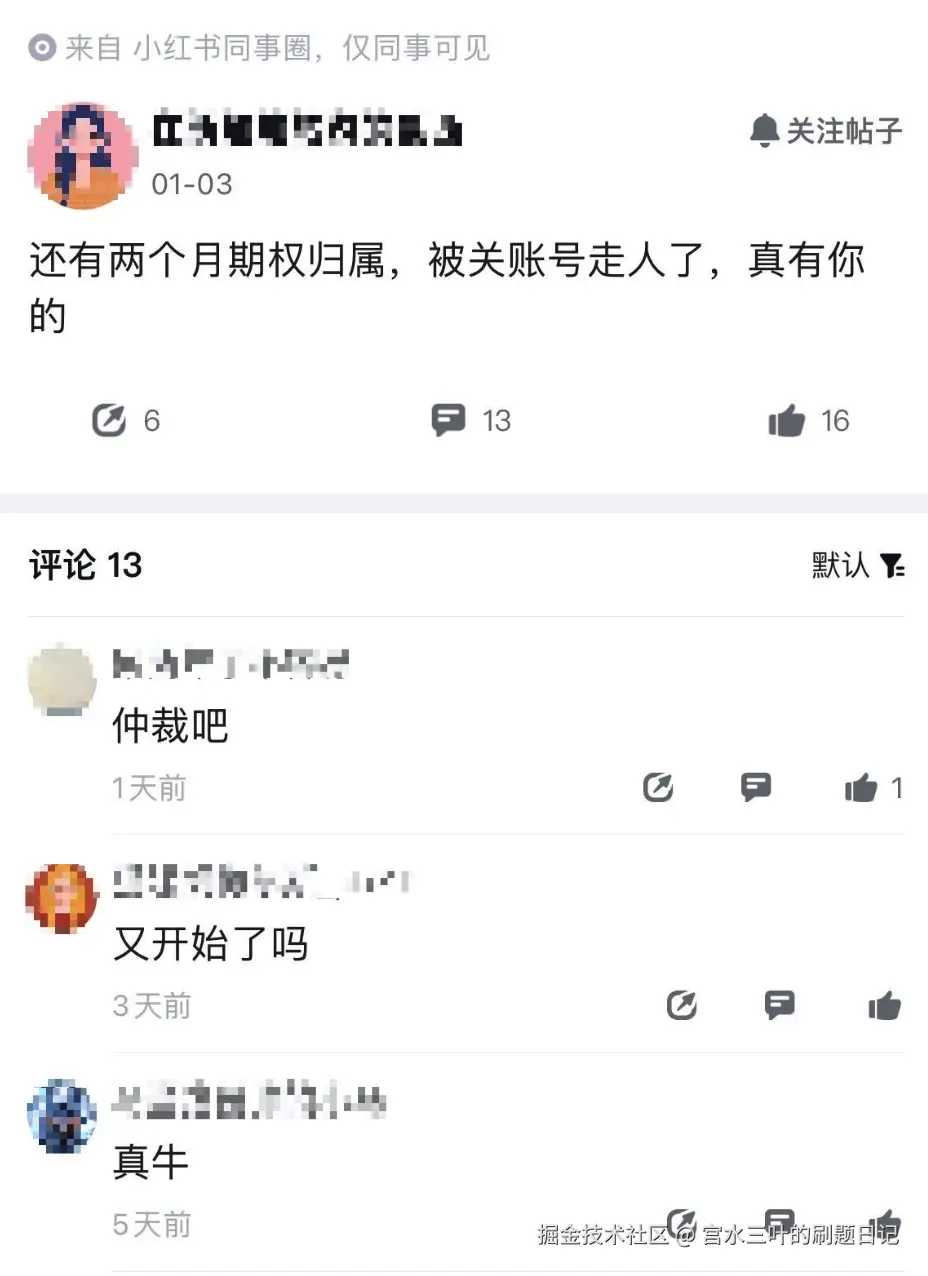 再进一步,深入到「仅 xhs 员工可见的同事圈」里,发现并不是"普天同庆,一片热烈"的内部氛围,反而更像是维权集中地。