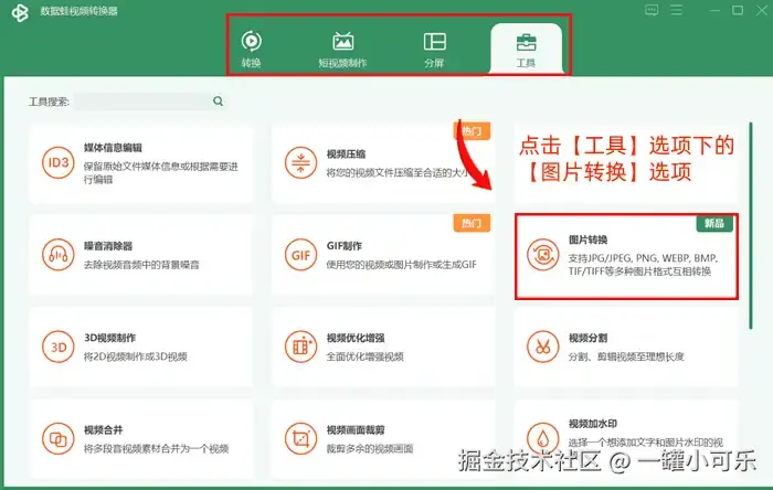 步骤1:双击打开桌面上的数据 蛙视频转换器,点击【工具】选项下的【图片转换】选项。