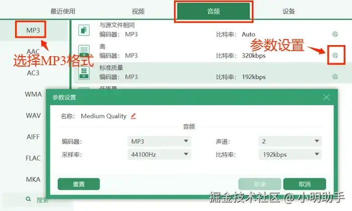 步骤3:在输出格式选择界面中选择MP3格式,有需要的话可以点击右侧小齿轮按钮设置相关参数。