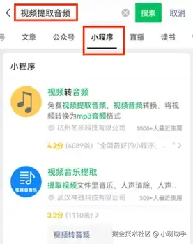 除了使用电脑之外,我们还可以使用手机小程序完成mp4音频提取在线操作。只需要在微信搜索栏搜索【视频提取音频】之类的关键词,选择自己觉得好用的小程序,简单几步就能完成转换。不过使用手机小程序进行转换虽然比较方便,但上传和下载的传输速度可能会不太稳定,转换质量也难以保证。