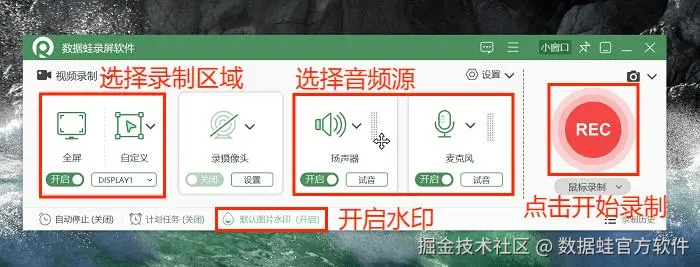 步骤2:接下来就可以去选择你想要录制的屏幕区域了,还可以自由选择需要录制的音频源。全部设置好了之后,还可以开启水印录制哦。确认设置无误后,点击“REC”按钮开始录制电脑屏幕。
